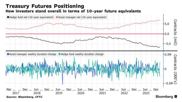 在美国国债期货方面,最新仓位数据显示,在2月13日1月CPI数据高于预期的当周内,资产管理公司净平仓量为2022年3月以来最大,相当于近26万个10年期国债期货。相当于近26万个10年期国债期货合约当量。与此同时,上周五的未平仓合约数据显示,在PPI高于预期后,收益率曲线前端空头头寸不断增加。