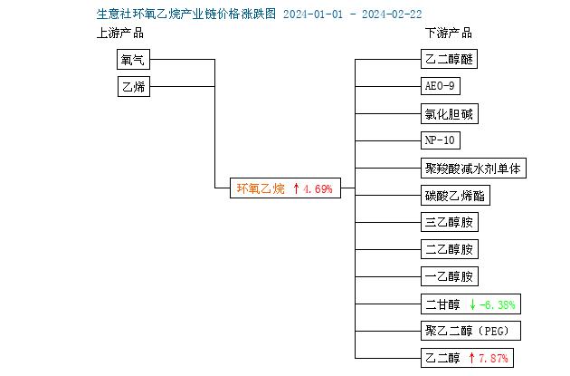节后环氧乙烷价格上行与主力下游聚羧酸减水剂单体企业需求相关性不高,主要是由于上游原料乙烯价格上行,环氧乙烷企业成本压力加大,水涨船高传导给环氧乙烷。相关产品乙二醇价格在前期上涨后,维持在高位震荡,也给环氧乙烷供应端利好预期。