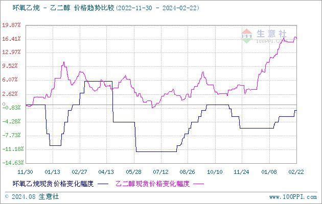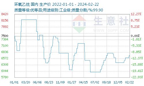 节后环氧乙烷价格小幅上扬,涨幅为1.52%。据生意社数据,截止2月22日,国内环氧乙烷市场均价6700元/吨,较节前上涨100元/吨;分地区来看,华东地区环氧乙烷市场对外执行67600元/吨;华南地区环氧乙烷市场挂牌价6700元/吨;华北环氧乙烷价格挂牌价6700元/吨;华中地区环氧乙烷市场挂牌价6750元/吨。