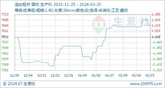 2月23日,生意社涤纶短纤基准价为7652.00元/吨,与本月初持平。