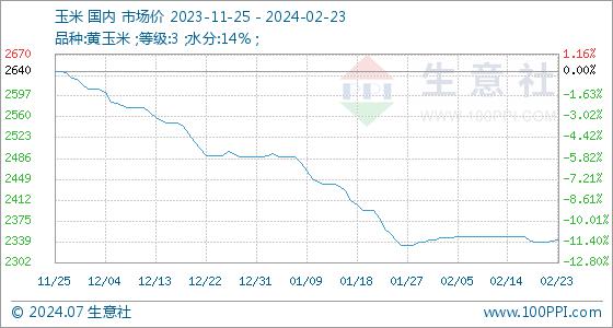 2月23日,生意社玉米基准价为2340.00元/吨,与本月初(2342.86元/吨)相比,下降了-0.12%。