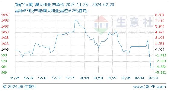 2月23日生意社铁矿石(澳)基准价为961.67元/吨