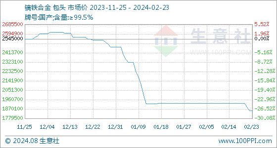 2月23日,生意社镝铁合金基准价为1855000.00元/吨,与本月初(1925000.00元/吨)相比,下降了-3.64%。