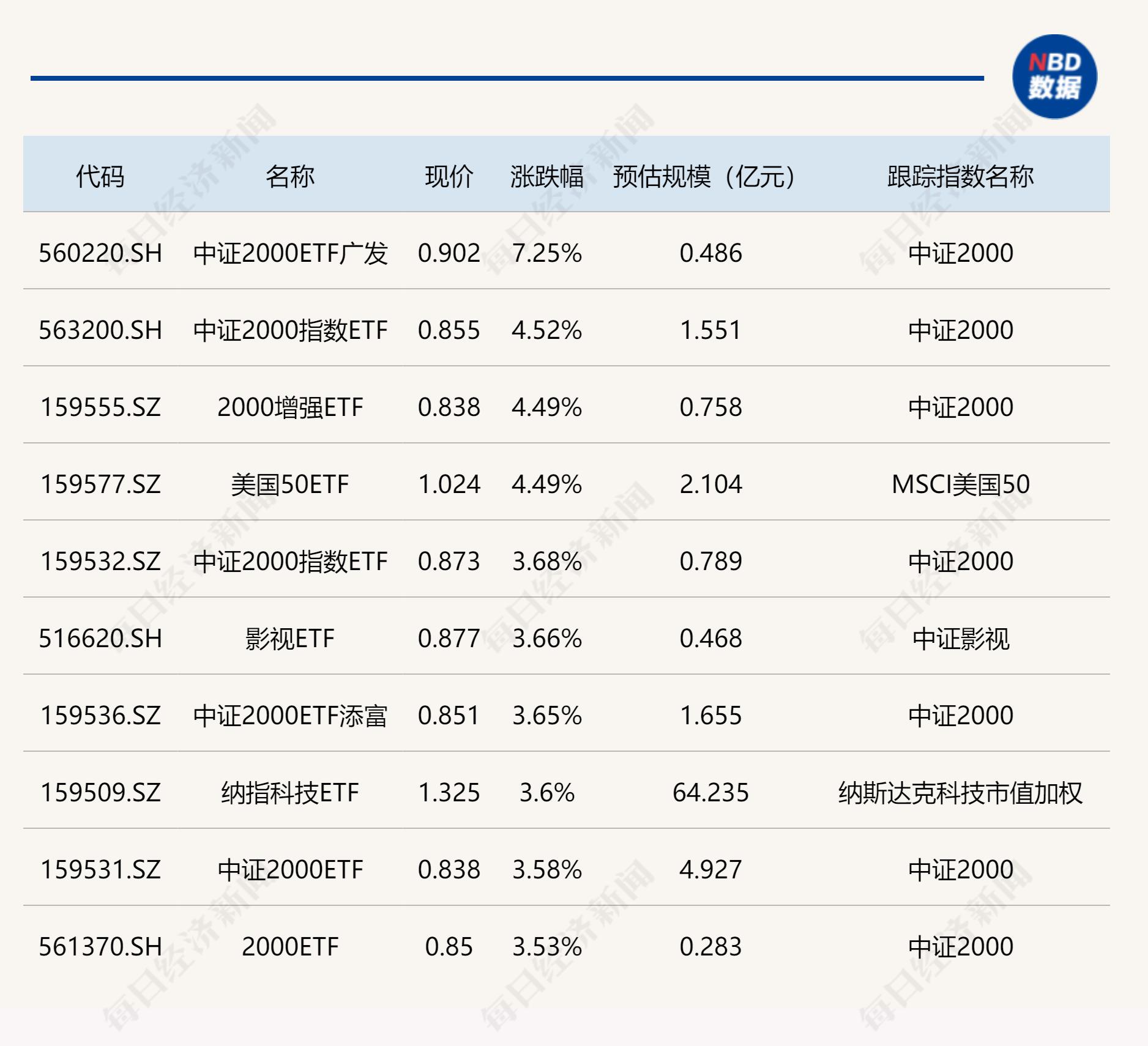 ETF涨跌幅方面,多只跟踪中证2000指数的ETF和美国50ETF涨逾4%。