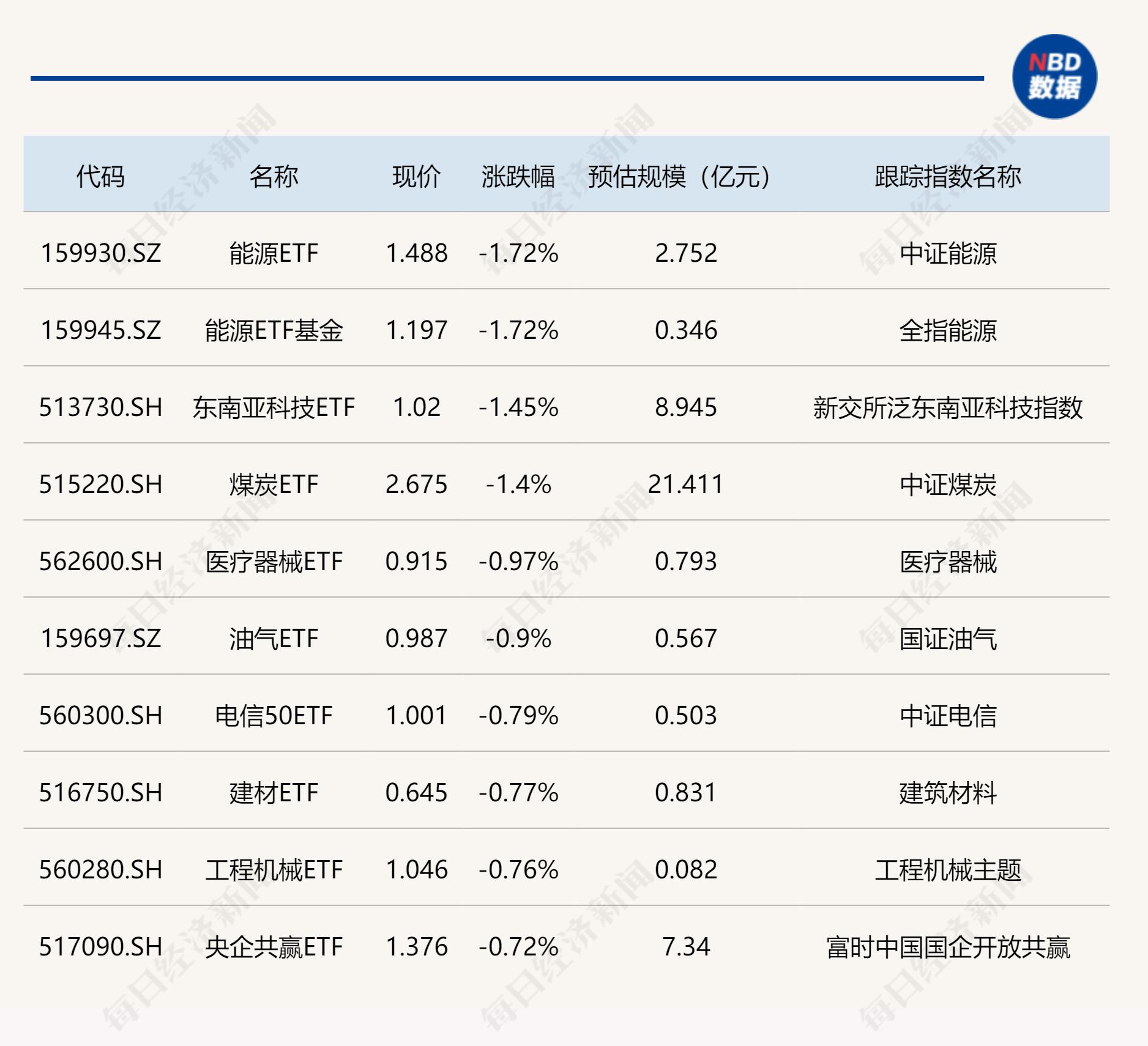 下跌方面,能源、煤炭相关ETF跌幅居前。