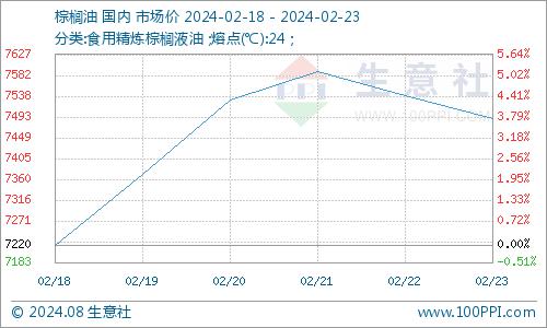 成本面:春节过后,棕榈油行情先涨后跌,2月21日为本周棕榈油价格最高点7590元/吨,随后缓慢滑落,截至今日棕榈油价格为7490元/吨,本周棕榈油涨幅为3.74%。