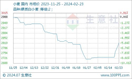 据生意社商品行情分析系统,春节后国内小麦市场价格止跌回暖。2月17日均价2728.00元/吨,2月23日均价2822.00元/吨,7日内上涨3.45%。