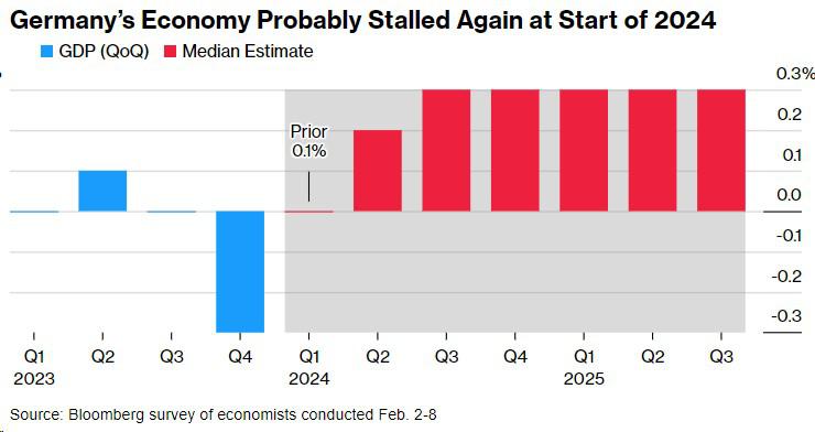 这些数据凸显了德国的长期疲软。在2023年经济收缩0.3%后,德国政府本周将其对2024年的增长预测下调至0.2%。