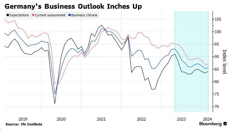 德国商业预期指数小幅回升,但仍停留在低迷水平,因为这个欧洲最大经济体前景黯淡。Ifo经济研究所周五公布的数据显示,德国2月IFO商业预期指数从1月的83.5升至84.1,略高于市场预期的84。德国2月IFO商业现况指数保持稳定。