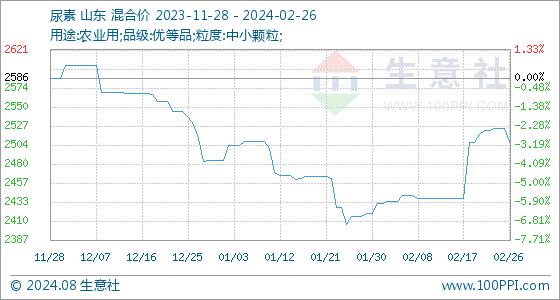 2月26日,生意社尿素基准价为2525.00元/吨,与本月初(2431.67元/吨)相比,上涨了3.84%。