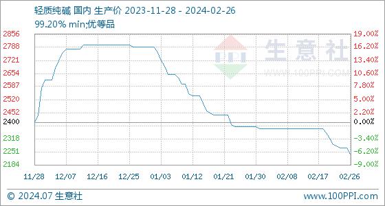 2月26日,生意社轻质纯碱基准价为2270.00元/吨,与本月初(2370.00元/吨)相比,下降了-4.22%。