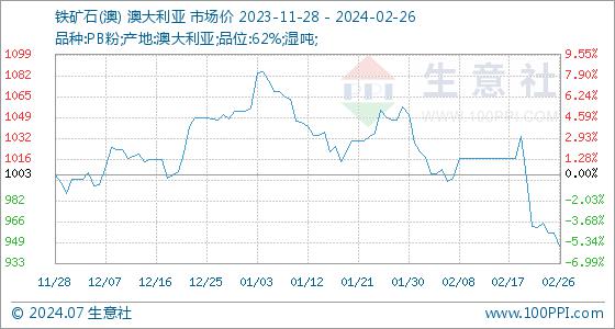2月26日,生意社铁矿石(澳)基准价为956.89元/吨,与本月初(1029.00元/吨)相比,下降了-7.01%。