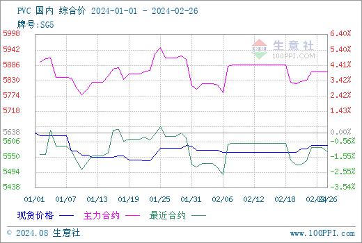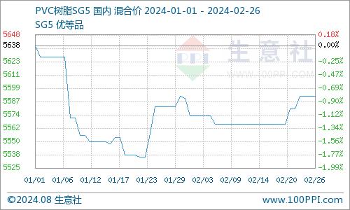 据生意社商品行情分析系统监测显示,年后PVC现货市场价格稳中有涨,2月17日国内PVC均价5566元/吨,2月26日均价为5592元/吨,周内价格上涨0.47%。