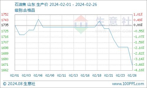 据生意社商品分析系统显示,节后地炼石油焦价格持续回落,截止到2月26日山东市场地炼石油焦价格为1670.00元/吨,较2月18日1732.50元/吨下跌3.61%。
