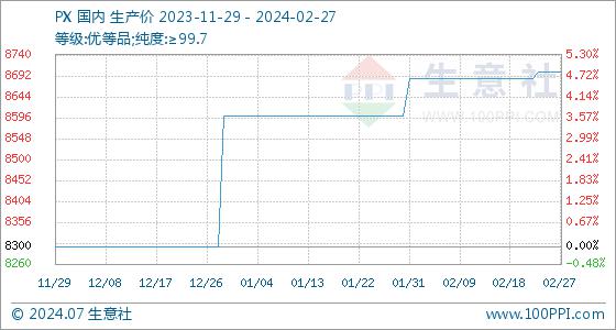 2月27日,生意社PX基准价为8700.00元/吨,与本月初(8685.71元/吨)相比,上涨了0.16%。