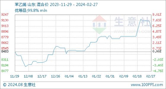 2月27日,生意社苯乙烯基准价为9110.00元/吨,与本月初(8810.00元/吨)相比,上涨了3.41%。