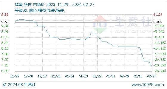 2月27日,生意社鸡蛋基准价为7.36元/公斤,与本月初(8.40元/公斤)相比,下降了-12.38%。