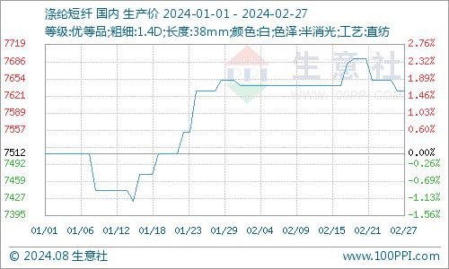 春节后原油价格转弱,原料价格转而下跌,涤纶短纤成本支撑减弱。供应面,节后涤纶短纤开工逐步提升,叠加需求尚待恢复中,工厂库存压力较大。基本面偏弱,导致短纤价格出现小幅下跌,据生意社商品行情分析系统,截止2月27日国内涤纶短纤市场价格7632元/吨,较2月17日下跌0.78%。