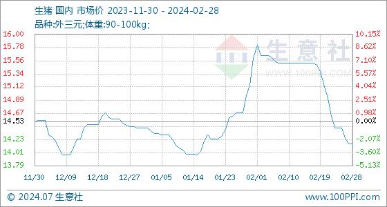 2月28日,生意社生猪基准价为14.15元/公斤,与本月初(15.60元/公斤)相比,下降了-9.29%。