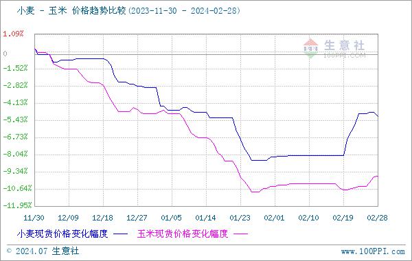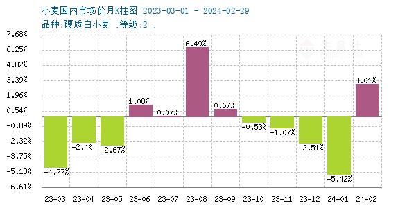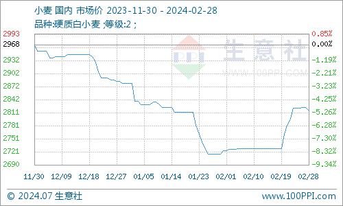 据生意社商品行情分析系统,2024年2月国内小麦市场价格整体止跌回升。2月1日均价2724.00元/吨,2月28日均价2816.00元/吨,月内上涨3.38%。