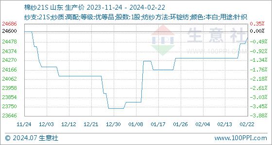2月22日生意社棉纱21S基准价为24466.67元/吨