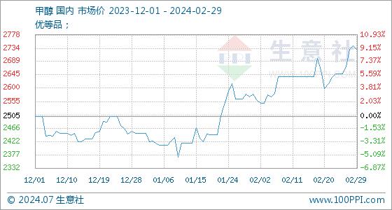 2月29日,生意社甲醇基准价为2741.67元/吨,与本月初(2580.83元/吨)相比,上涨了6.23%。