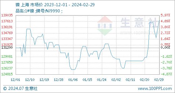 2月29日,生意社镍基准价为135766.67元/吨,与本月初(128966.67元/吨)相比,上涨了5.27%。
