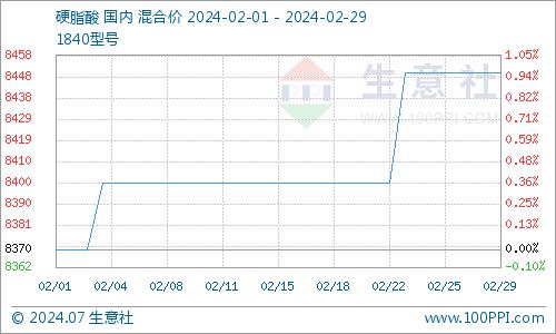 据生意社商品行情分析系统监测,2月硬脂酸1840在7850元/吨~9000元/吨,主流价格是8500元左右,较春节前每吨上涨50元,涨幅为0.6%。印尼进口硬脂酸价格在9500元/吨~8200元/吨之间。