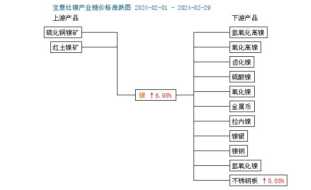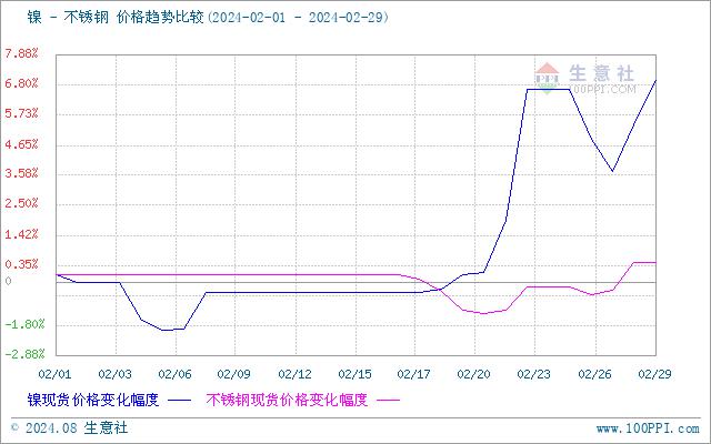据生意社价格监测,2月份,上半月由于春节,不锈钢和镍价格整体较为平稳,节后,不锈钢价格先下跌后涨,截止月末,不锈钢现货价格13150元/吨,较月初上涨0.05%。上游镍,节后则先涨后跌现有小幅反弹,截止月末,现货镍报价135766.67元/吨,较月初上涨5.37%。