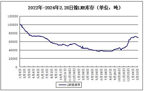 据上图所示,2月,LME镍库存先涨后跌,截止月末,LME镍库存69330吨,较月初下跌2.56%,较年初下跌8.06%。年后全球镍库存有所下降。