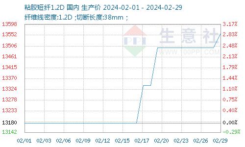 据生意社商品行情分析系统显示,2024年2月,粘胶短纤整体价格稳中上涨。截止2月29日,1.2D*38mm粘胶短纤国内地区出厂报价为13560元/吨,较月初价格上涨380元/吨,月涨幅2.88%。
