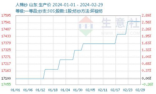 2月,人棉纱行情整体稳中偏强,价格跟随原料粘胶短纤小幅上扬,部分纱厂报价略有提升,优惠略有缩减,整体出货一般,库存基本维持。截止2月29日人棉纱(30S,环锭纺,一等品)出厂均价为17550元/吨,较2月初价格上涨225元/吨,涨幅1.30%。