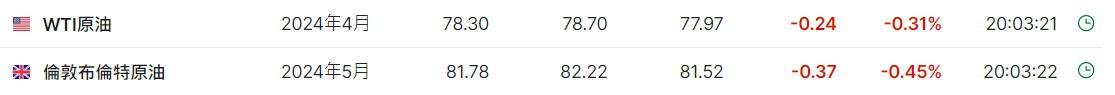 3. 截至发稿,WTI原油跌0.31%,报78.30美元/桶。布伦特原油跌0.45%,报81.78美元/桶。