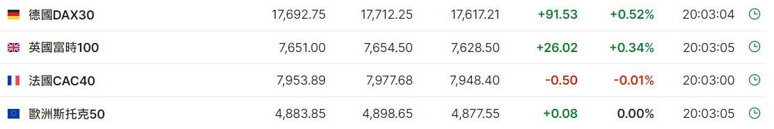 2. 截至发稿,德国DAX指数涨0.52%,英国富时100指数涨0.34%,法国CAC40指数跌0.01%,欧洲斯托克50指数涨0.00%。