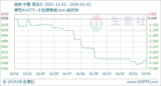 3月1日,生意社硅铁基准价为6407.14元/吨,与上月初(6421.43元/吨)相比,下降了-0.22%。