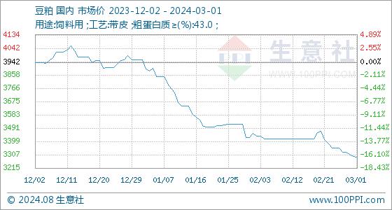3月1日,生意社豆粕基准价为3296.00元/吨,与上月初(3424.00元/吨)相比,下降了-3.74%。