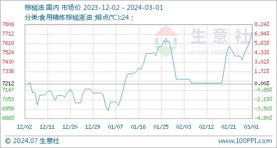 3月1日,生意社棕榈油基准价为7634.00元/吨,与上月初(7258.00元/吨)相比,上涨了5.18%。