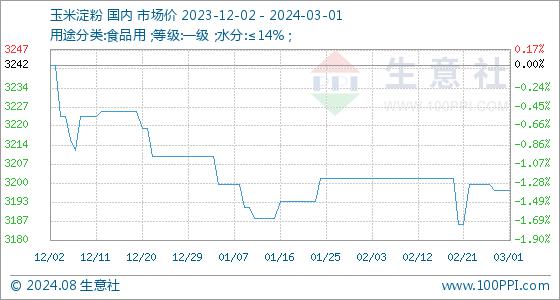 3月1日,生意社玉米淀粉基准价为3198.00元/吨,与上月初(3202.00元/吨)相比,下降了-0.12%。