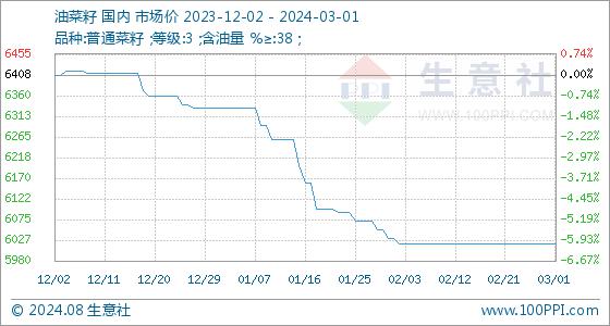 3月1日,生意社油菜籽基准价为6020.00元/吨,与上月初(6032.00元/吨)相比,下降了-0.20%。