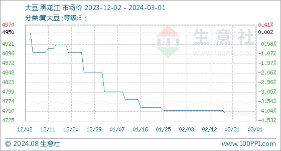 3月1日,生意社大豆基准价为4746.00元/吨,与上月初(4752.00元/吨)相比,下降了-0.13%。