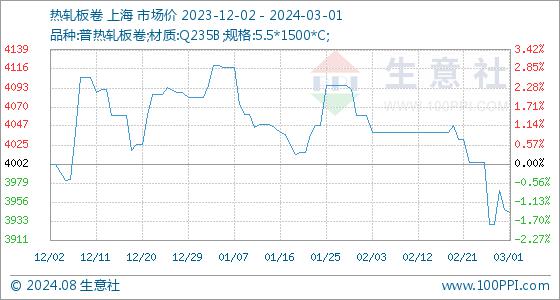 3月1日,生意社热轧板卷基准价为3948.00元/吨,与上月初(4060.00元/吨)相比,下降了-2.76%。