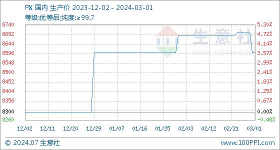 3月1日,生意社PX基准价为8600.00元/吨,与上月初(8685.71元/吨)相比,下降了-0.99%。