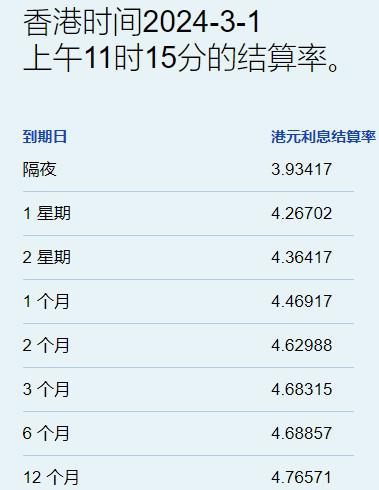 3月1日,港元拆息几乎全线下跌。其中,隔夜息急降103基点,报3.93417%;与楼按相关的一个息跌至4.46917%;反映银行资金成本的三个月拆息降至4.68315%,见逾一周新低,与同期美元LIBOR息差维持92基点。长息方面,六个月期跌至4.68857%,而一年期则维持4.76571%。港元汇价盘中最低曾见7.8298兑1美元,为去年10月19日以来最低。