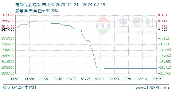 2月19日,生意社镝铁合金基准价为1925000.00元/吨,与本月初持平。