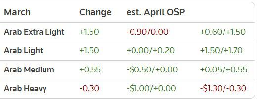 以下是沙特4月份的OSP出口预期价格(以美元/桶计算,相对于阿曼/迪拜的平均价格):