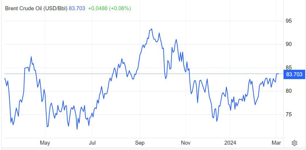 国际原油基准价格线——布伦特原油价格未因欧佩克+减产措施而大幅提升,主要因该联盟延长减产措施至第二季度的决定可能已经被交易员们广泛预期。截至发稿,布伦特原油期货价格仅仅涨0.06%至83.70美元/桶。围绕以色列和巴勒斯坦哈马斯之间停火谈判的不确定性,以及胡塞对红海地区航运的持续袭击,短期可能将成为油价上行的主要刺激因素。
