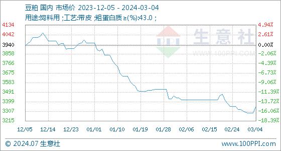 3月4日,生意社豆粕基准价为3292.00元/吨,与本月初(3296.00元/吨)相比,下降了-0.12%。