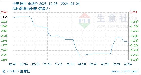 3月4日,生意社小麦基准价为2800.00元/吨,与本月初(2806.00元/吨)相比,下降了-0.21%。