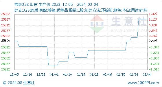 3月4日,生意社棉纱32S基准价为25900.00元/吨,与本月初持平。