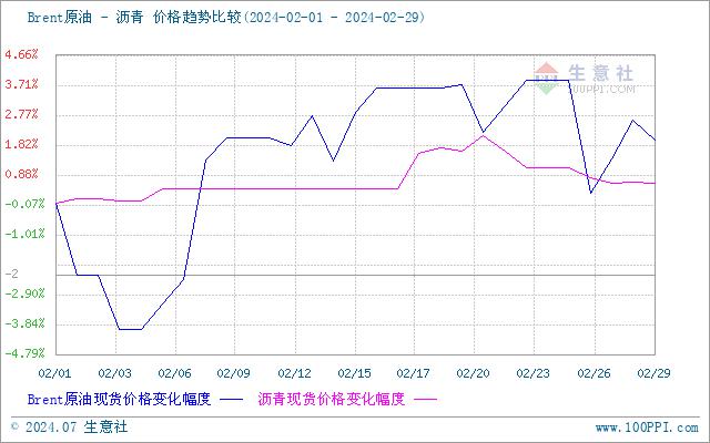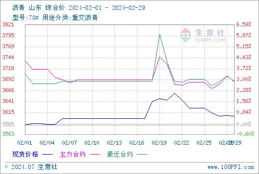 据生意社商品行情分析系统,2月国内沥青市场行情窄幅波动。2月1日至29日,山东地区沥青生产者均价自3585元/吨上涨至3606元/吨,涨幅0.60%,价格同比下跌7.31%。